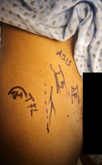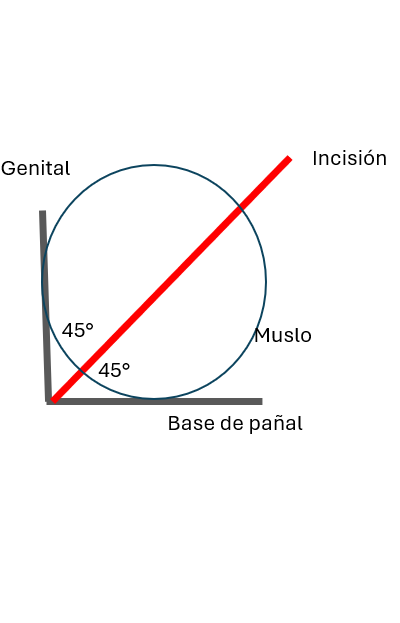 La herida se encuentra a 45° entre la zona genital y la superficie del colchón (base del pañal en adultos mayores que lo requieren). Es una zona muy accesible para curaciones de la herida sin tener que girar al paciente.